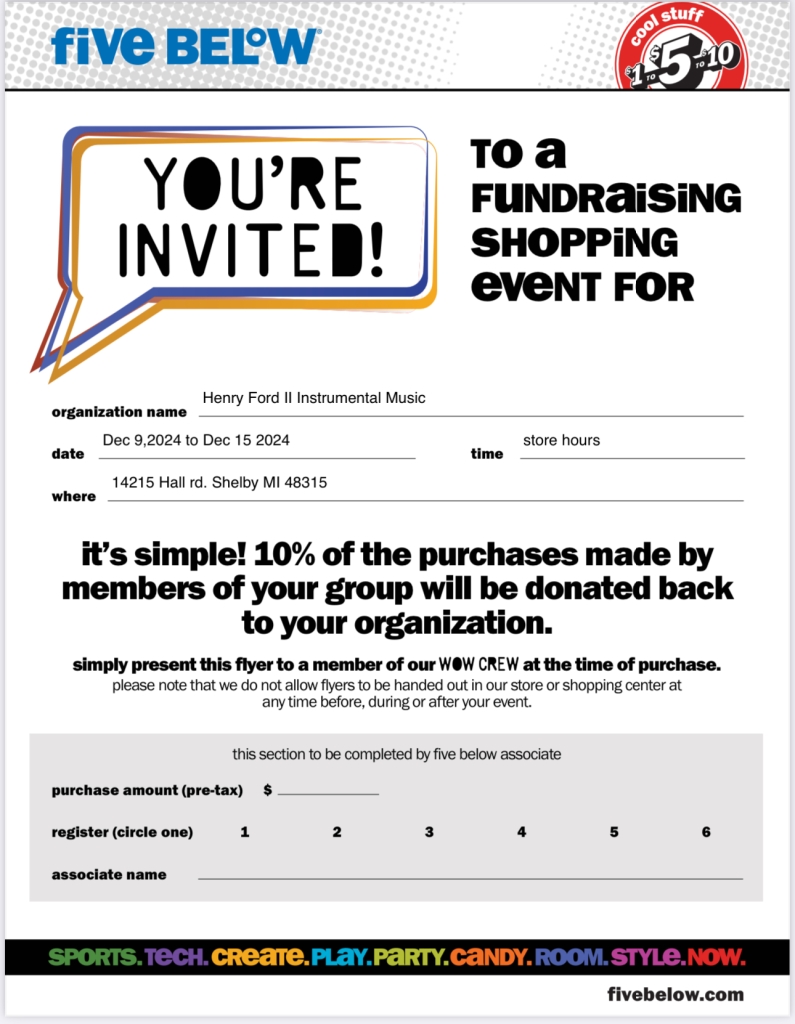Call (586)566-1233 and mention that you are with Henry Ford II Instrumental Music Boosters before placing your order. This does not include 3rd-party delivery apps.